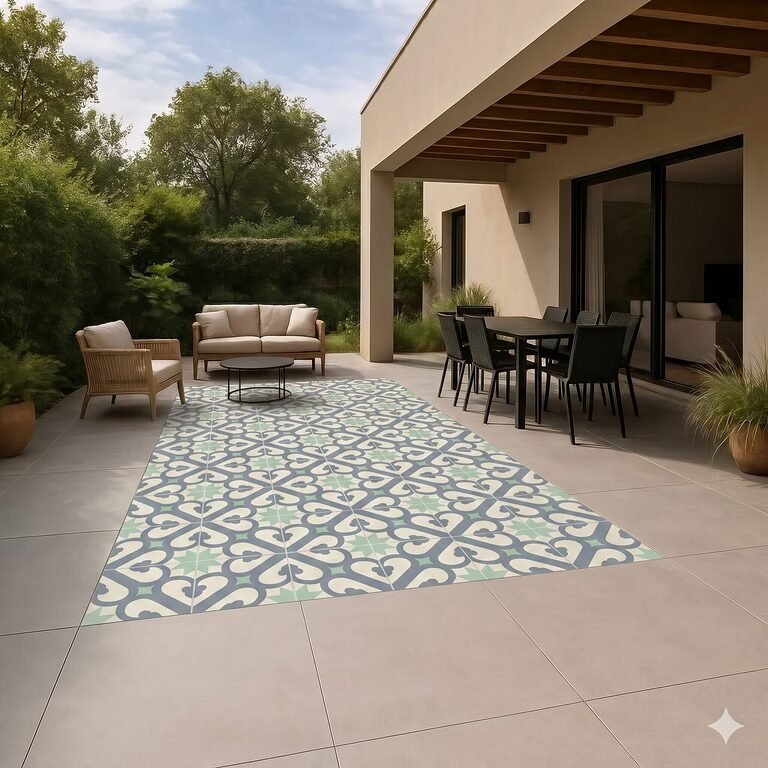 ¿Te imaginas un gran manto sobrio, tipo cemento, en la mayor parte de la terraza y una alfombra central de baldosas decoradas en la zona de comedor? Esa mezcla de gran formato y motivo artesanal funciona de maravilla, sobre todo en viviendas mediterráneas o proyectos con aire vintage.