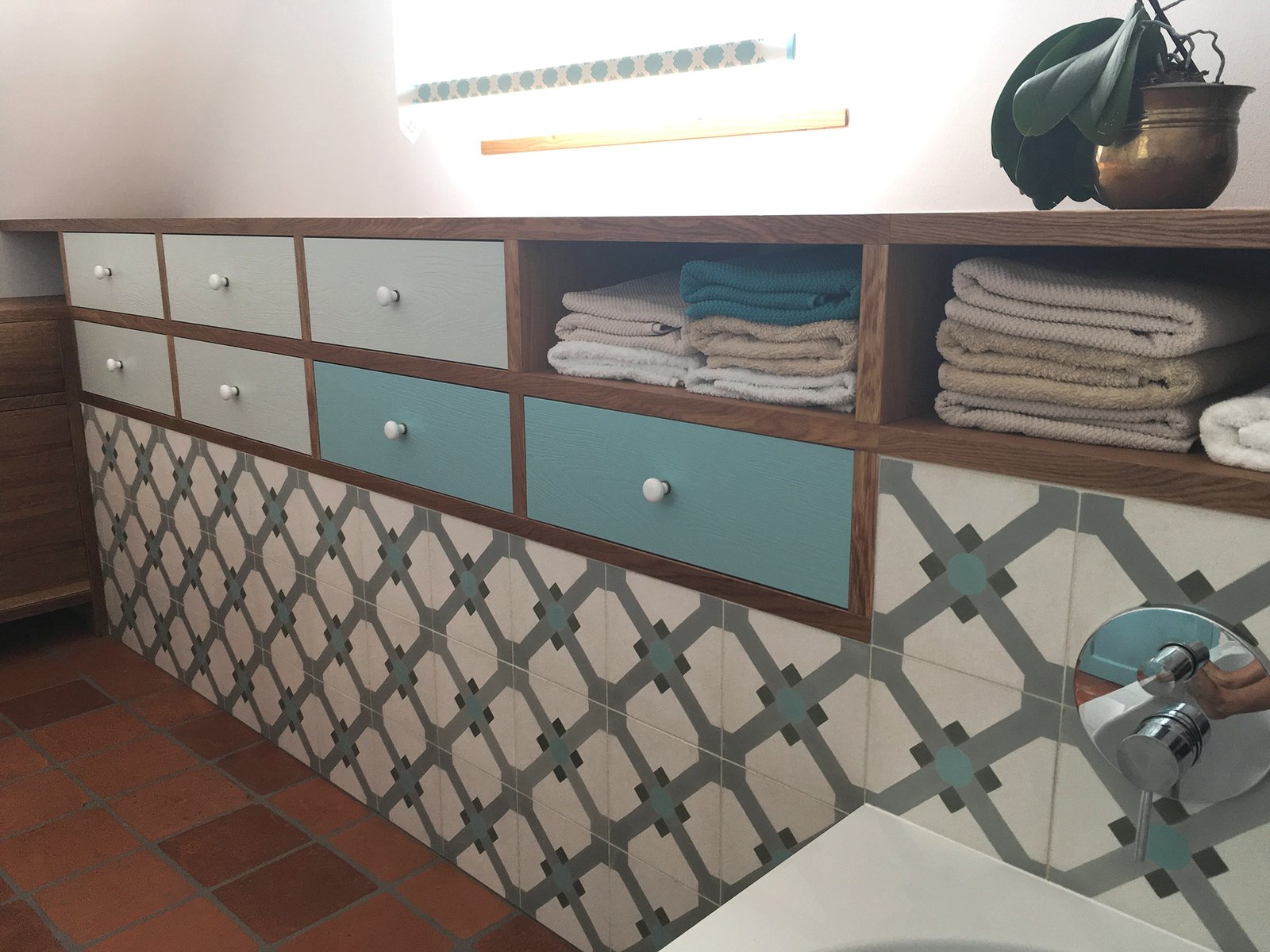 The composition of the hydraulic tile is based on grey cement, white cement, marmolina (fine marble dust), sand and pigments. The different elements are put into a mould inside a hydraulic press and when they are pressed, a tile is made, which is then moistened and finally hardened and dried in the air. The hydraulic tiles are made one by one by a craftsman, as always, with a hydraulic press. The craftsmanship of these tiles makes them unique pieces, and there may be a slight difference in the tones and colours of the tiles. The hydraulic tiles are mainly used for floors, although they are also placed on walls, decorating all kinds of rooms, as well as in swimming pools, benches, fountains, etc… We offer a large number of designs in hydraulic mosaic, allowing the customer to design their own floor with our simulator or choose one of the models we have in stock. We will also show the customer how to lay it and how to maintain it correctly. We advise our clients, therefore, in the initial phase of choosing the tile, in its installation and maintenance and then we accompany them in the resolution of any incident.