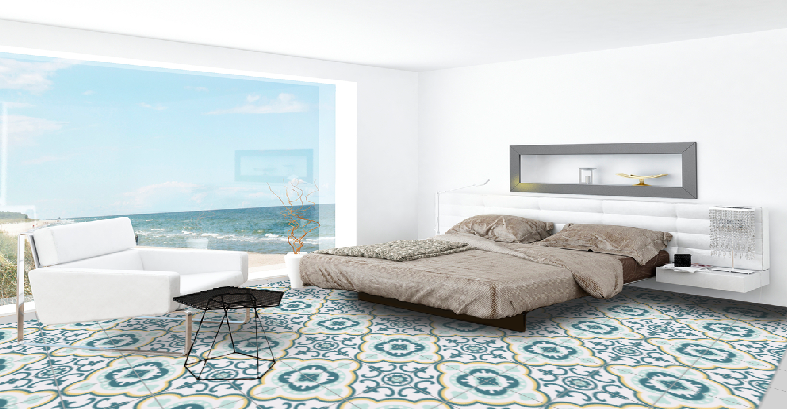 The composition of the hydraulic tile is based on grey cement, white cement, marmolina (fine marble dust), sand and pigments. The different elements are put into a mould inside a hydraulic press and when they are pressed, a tile is made, which is then moistened and finally hardened and dried in the air. The hydraulic tiles are made one by one by a craftsman, as always, with a hydraulic press. The craftsmanship of these tiles makes them unique pieces, and there may be a slight difference in the tones and colours of the tiles. The hydraulic tiles are mainly used for floors, although they are also placed on walls, decorating all kinds of rooms, as well as in swimming pools, benches, fountains, etc… We offer a large number of designs in hydraulic mosaic, allowing the customer to design their own floor with our simulator or choose one of the models we have in stock. We will also show the customer how to lay it and how to maintain it correctly. We advise our clients, therefore, in the initial phase of choosing the tile, in its installation and maintenance and then we accompany them in the resolution of any incident.